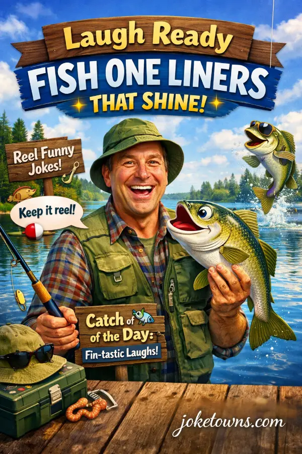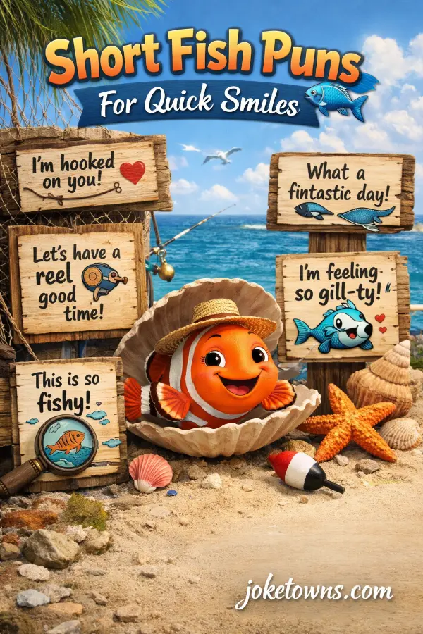 Fresh laughs arrive fast with short fish puns that read clean and sound clever. Quick fish one liners work great for captions, cards, and casual chats.