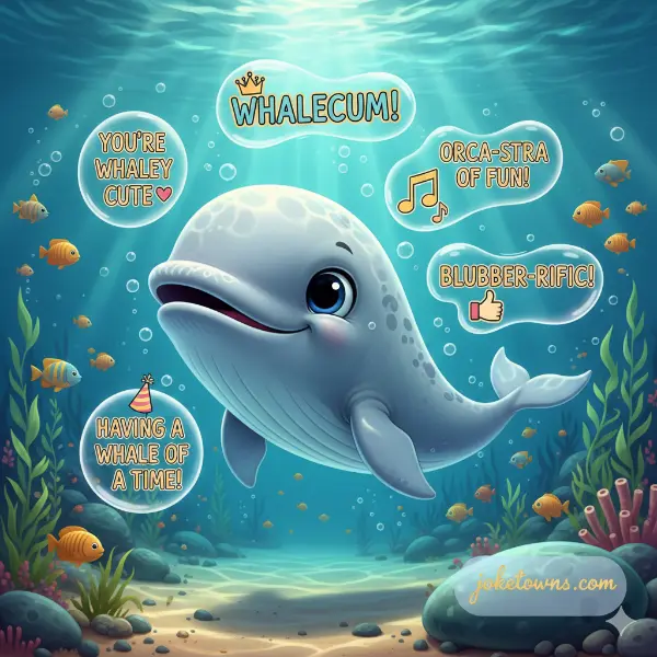 Family-friendly whale humor makes everyone giggle. Kids and adults love these playful ocean puns.